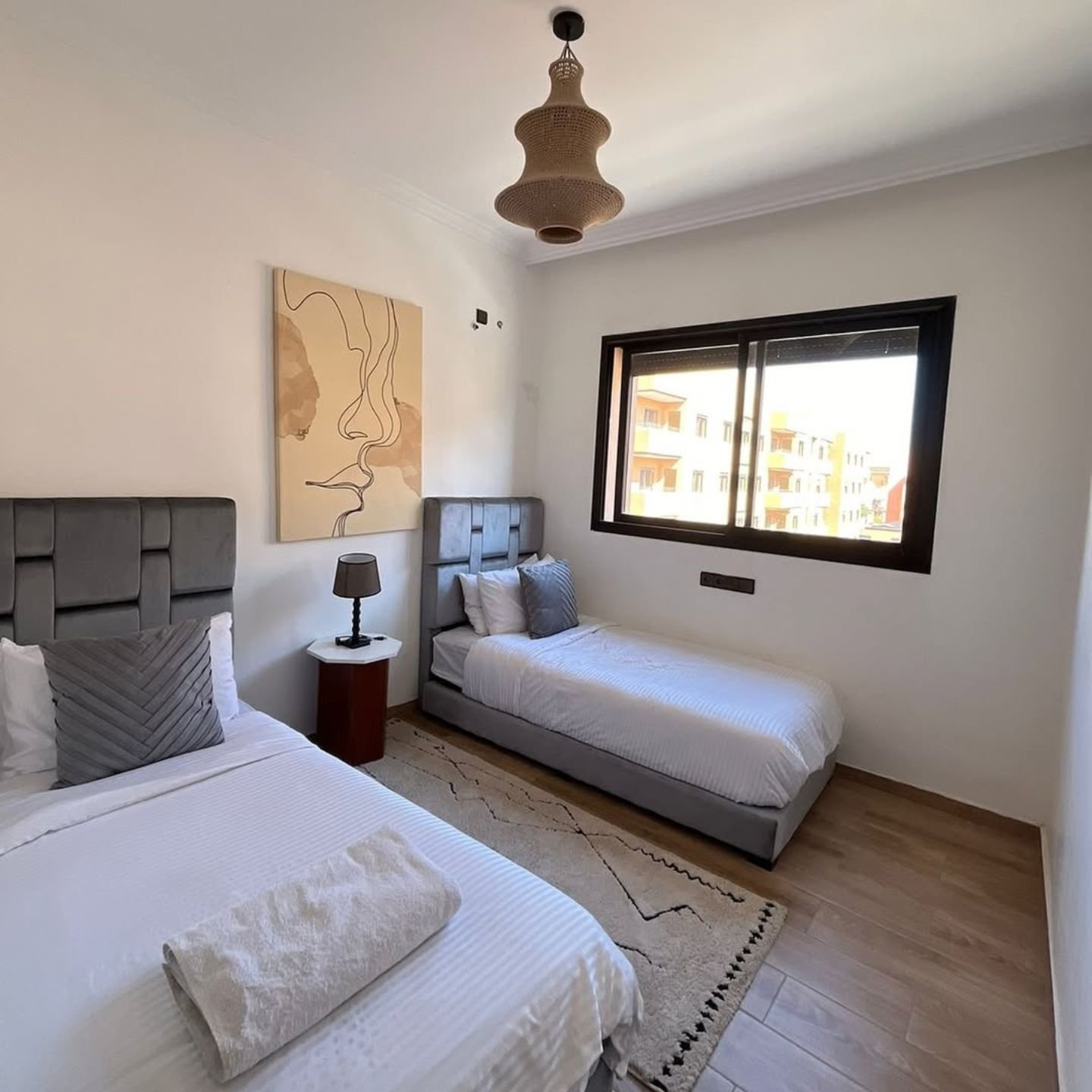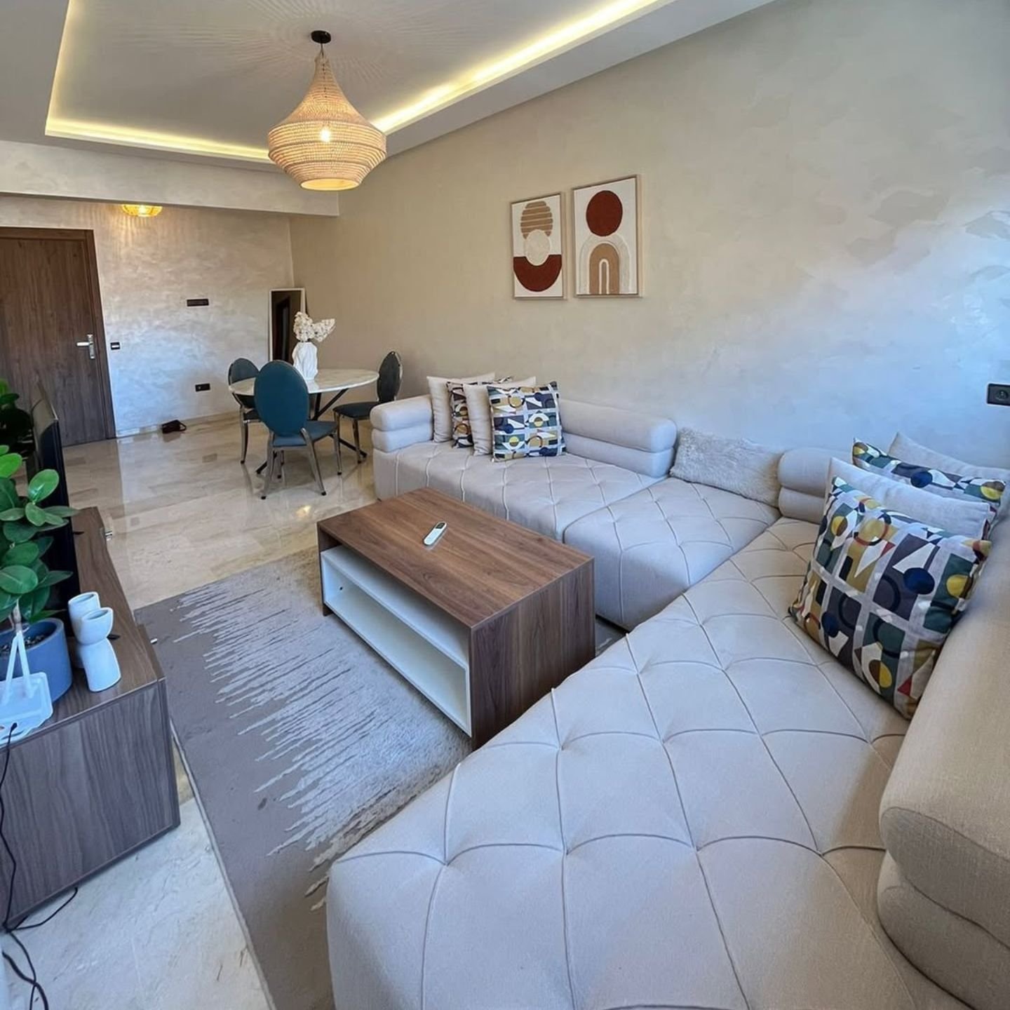 This beautiful 2-bedroom apartment is ideally located in the heart of Guéliz, just a 2-minute walk from the Guéliz train station, within a secure and well-maintained residence. Its central location provides immediate access to shops, cafés, and all city amenities.